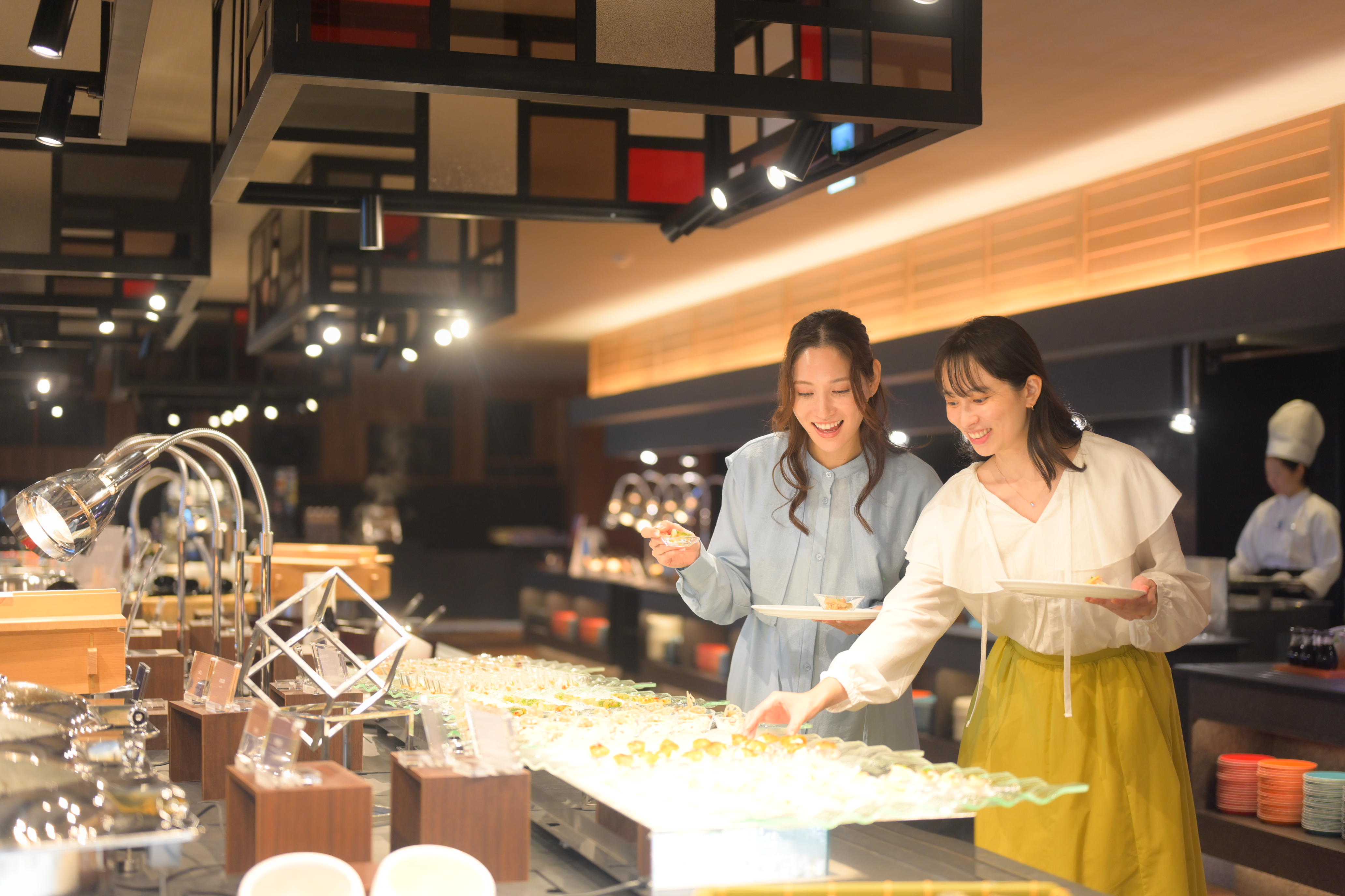 レストランは客室キャビンやマリンテイストの装飾が随所にあしらわれ、まるで船上のレストランのよう。美しいコートヤードの景色を望める席もございます。お食事はTAOYAブランドにふさわしい豪華なバイキングをご用意。夕食時のライブキッチンでは「焼きたてステーキ」*をご提供し「まぐろ(キハダ)の解体ショー」も毎日実施。「浜焼き」「紀州梅まだい握り」「うなぎ蒲焼」など海の幸も豊富にございます。ご当地メニューは「紀の国みかんどり手羽元のシンガポール風ガイトート」「和歌山ラーメン」「めはり寿司」などを揃え、デザートも充実しております。