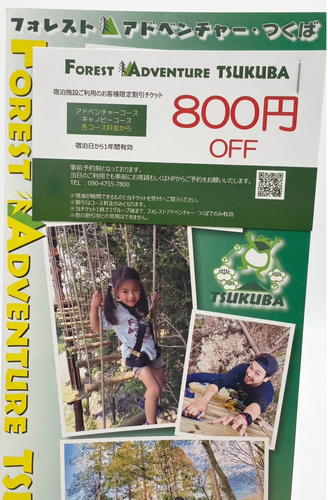 ホテル一望に宿泊されたお客様に、フォレストアドベンチャー・つくばの「アドベンチャーコース」「キャノピーコース」各800円引きの優待チケットを進呈します。本券1枚で1グループまで有効なため、ファミリーや学生グループ、社員旅行など、大人数でのご利用を強力にバックアップします。
