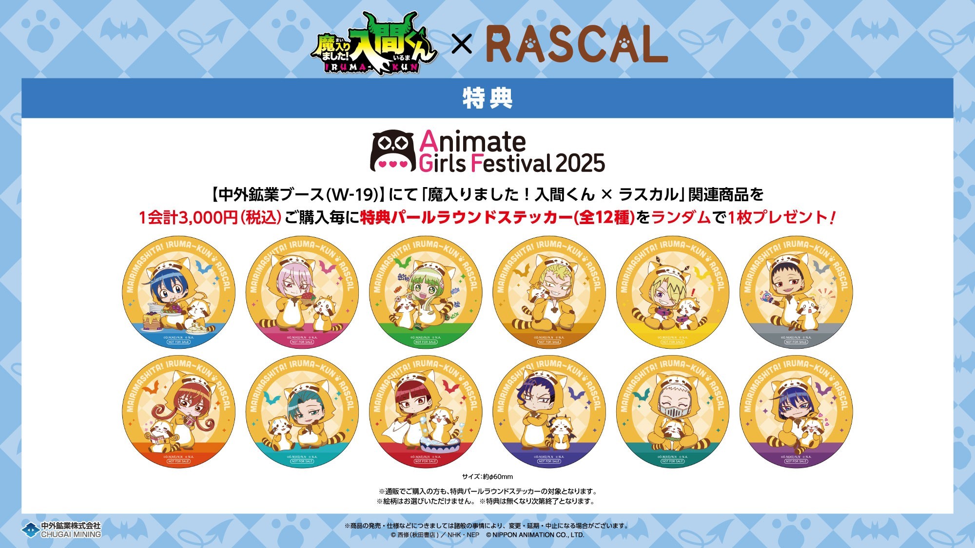 中外鉱業ブースにて『魔入りました!入間くん × ラスカル』AGF関連商品を1会計3,000円(税込)ご購入毎に、特典パールラウンドステッカー(全12種)をランダムで1枚お渡しいたします!