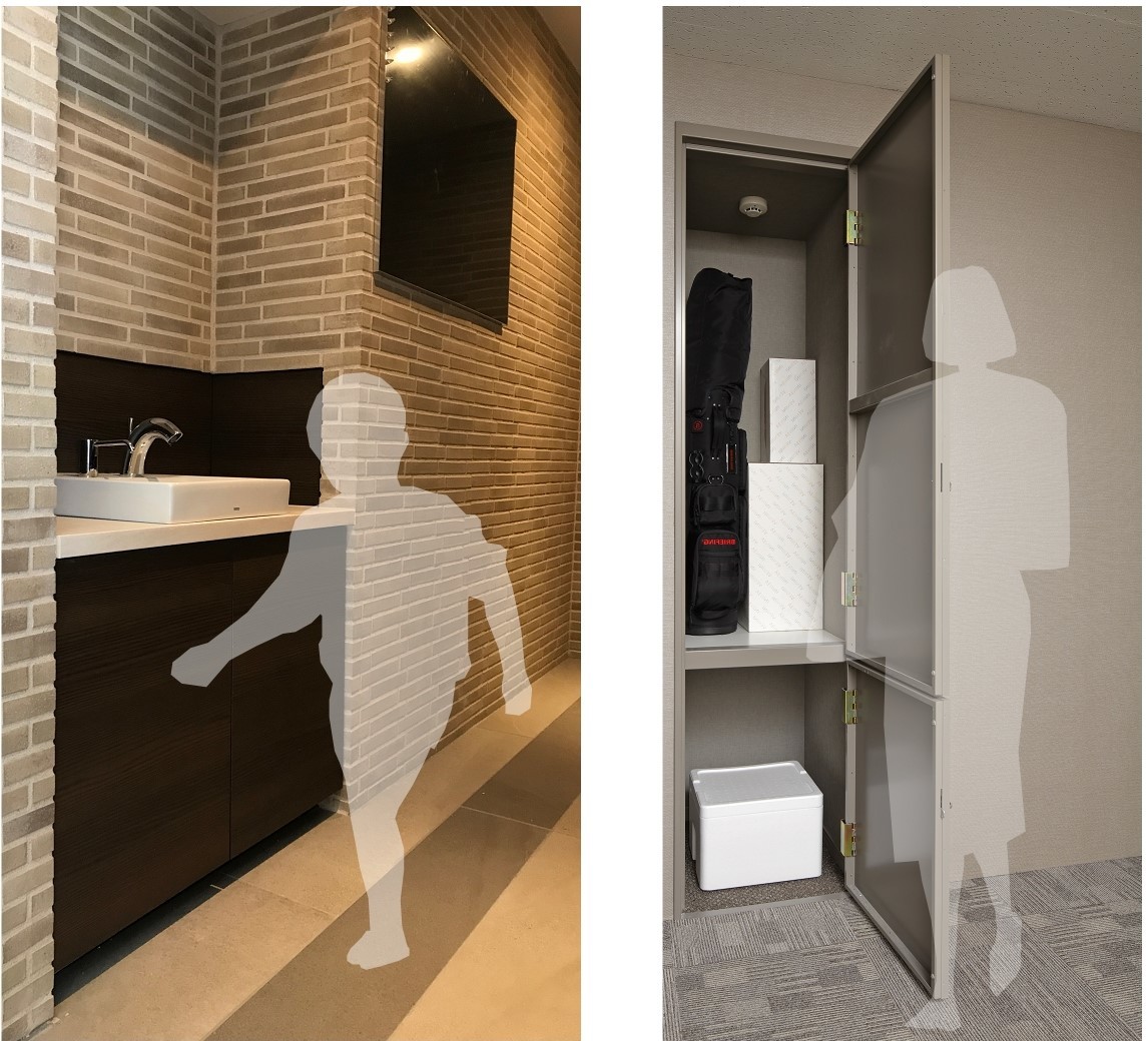1.共用エントランスに自動水栓・ソープディスペンサを備えた手洗いを設置。