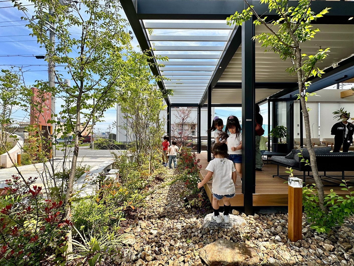 屋内外がフレキシブルに利用できるテラス付きの空間で、コロナ禍でも対応可能な密にならない待合室を作りました。賑やかなお兄ちゃん、お姉ちゃんが一緒でも安心です。通院する月日を愛おしく感じていただける場所です。