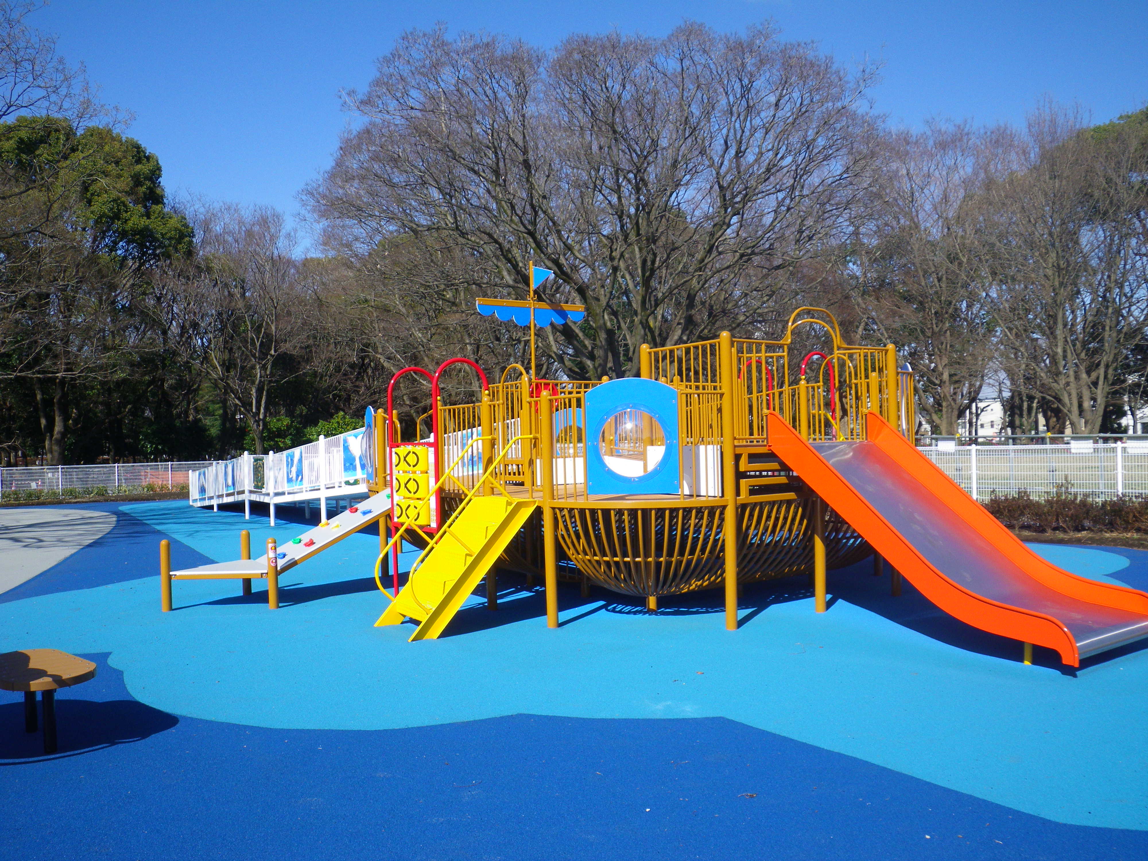 車いすや歩行器のまま「乗船」し、船のトップデッキまで上がれる船型遊具「みらい号」や、複数のデッキがスロープでつながり、だれもがてっぺんの滑り台を楽しめるよう設計された複合遊具、皿型ブランコ、イス型ブランコなど遊びに来たすべての人が楽しめるインクルーシブ遊具が設置されています。