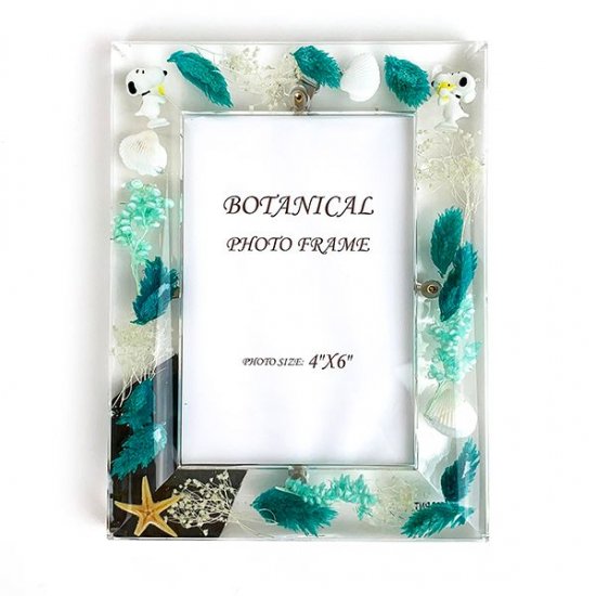 こちらは、フォトフレームです。写真を飾るスペースの周りに、ハーブやシェルなどが飾られています。上部の両端には、スヌーピーのフィギュアも♪