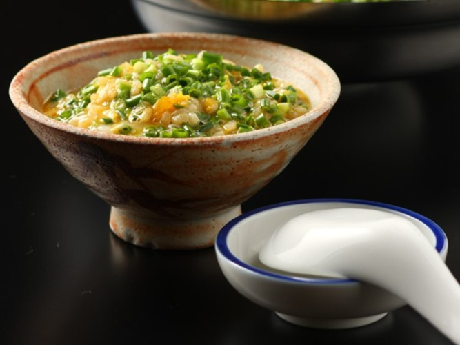 創業天保元年・あんこう料理専門店「いせ源」のあんこう鍋を提供します。冬に旬を迎えるあんこうや独活(うど)などを、江戸時代から続く一子相伝の醤油仕立ての割り下で煮立てて味わう一品です。「いせ源」では、骨抜きや下茹でなどの丁寧な下ごしらえをしているため、あんこう本来の奥深い味わいを堪能できます。また、あん肝や大身(だいみ)、皮や鰭(ひれ)など、あんこうの7つ道具(*1)を入れているので、部位ごとに異なる食感が楽しめます。鍋の〆は、あんこうの旨味が染み出した出汁で仕立てるおじやです。一口食べれば、思わず笑みが溢れるほどの味わいが口一杯に広がります。「いせ源」の女将から指導を受けたスタッフが火加減や〆作りのサポートを行うので、銘店の味を堪能できます。