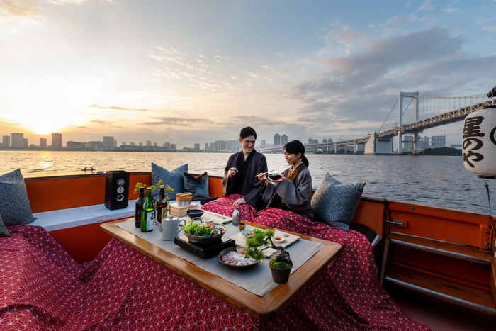暖かな色合いの行灯を設えた舟の桟敷席では、炬燵で暖を取りながら、ゆったりと水辺の景色を一望できます。炬燵の布団カバーは、手ぬぐいと浴衣地の老舗「戸田屋商店」による、江戸小紋の麻の葉をイメージした柄で、星のや東京オリジナルの仕立てです。江戸更紗のクロスや小紋柄の染め型行灯など、江戸時代から続く東京の伝統工芸の技を散りばめた空間でくつろげます。