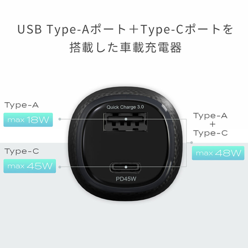「MOT-DCPD45U1-BK」はUSB Type-AポートがQuick Charge3.0対応の最大18W出力、USB Type-CポートがPower Delivery3.0対応の最大45W出力で、2ポート同時に使用しても合計出力48Wの高出力対応となっています。
