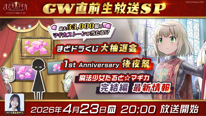 株式会社アニプレックス(本社:東京都千代田区 代表取締役 西本修 以下アニプレックス)は、『魔法少女まどか☆マギカ Magia Exedra』(Magia Exedra:マギアエクセドラ)の公式番組「魔法少女まどか☆マギカ Magia Exedra エクセドラ通信#25 GW直前生放送SP」を4月23日(木)20時より生配信することを決定いたしました。