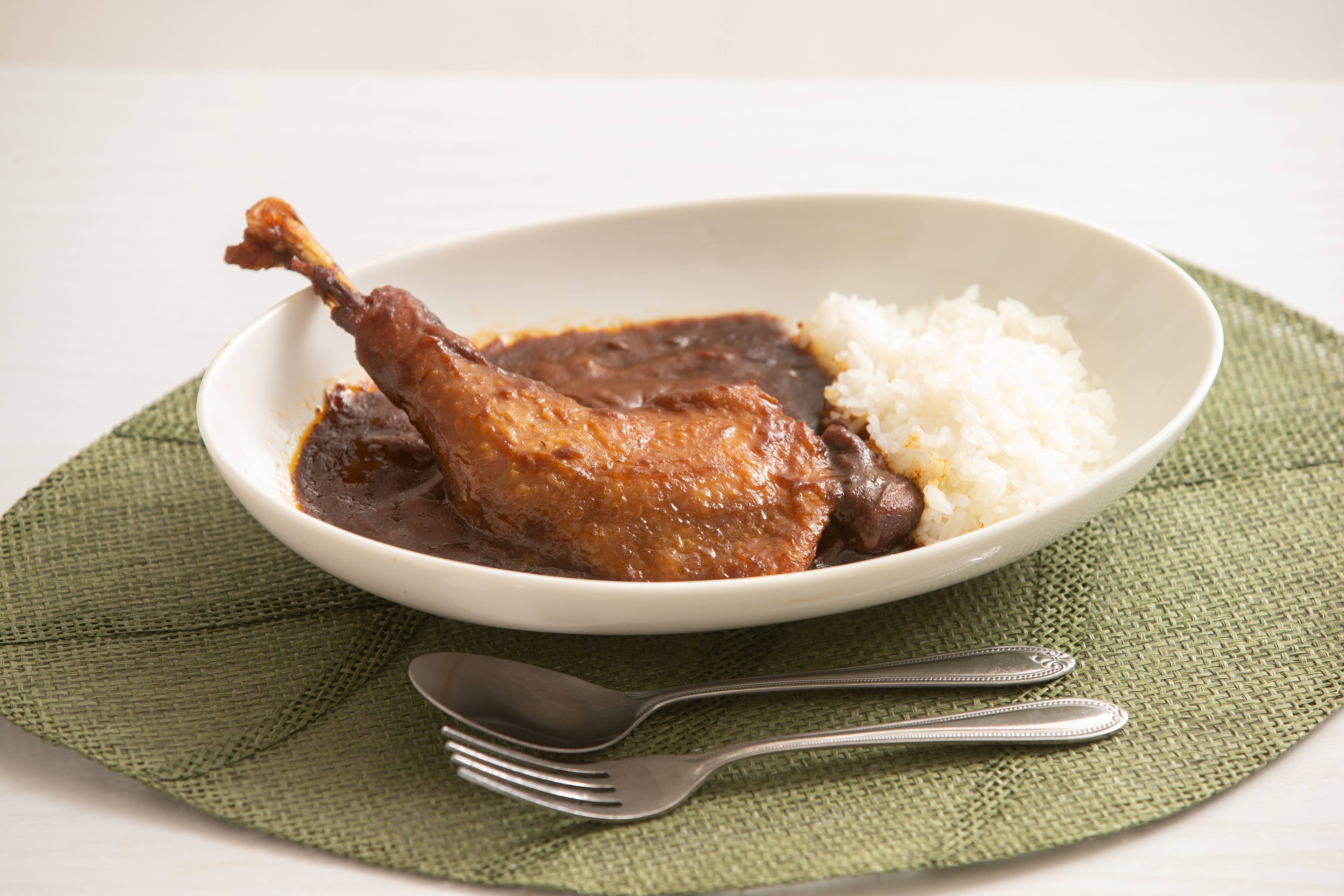 深い旨味を持つおやどりの骨付きモモ肉を丸ごと1本入れた「六ツ美のあの肉カレー」と大正時代の復古品種であり大正天皇ゆかりの縁起米「萬歳」の詰め合わせです。非常食に彩をもたらします。