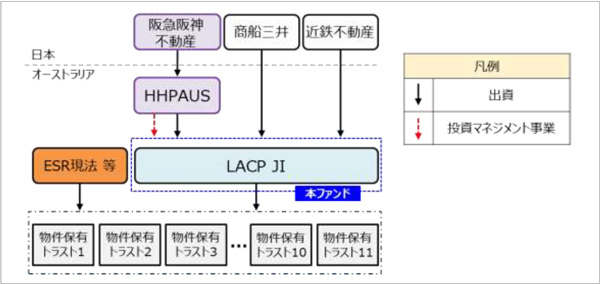 今後は、下図のとおり、HHPAUSのほか2社がLACP JIにそれぞれ増資を行い、本物件を保有するトラスト(不動産信託)の持分を取得することにしています。