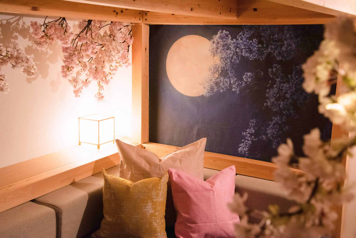 外でのお花見は天候に左右されてしまいますが、客室でのお花見なら天候の心配もなく安心。また、夜には提灯で桜の装飾が照らされることで、よりピンク色が強調され、夜桜を楽しんでいるような感覚になれちゃいます。夜桜を見るにはまだ肌寒い季節に、寒さを感じることなく、プライベート空間の中で寛ぎながらお花見気分を味わえます。