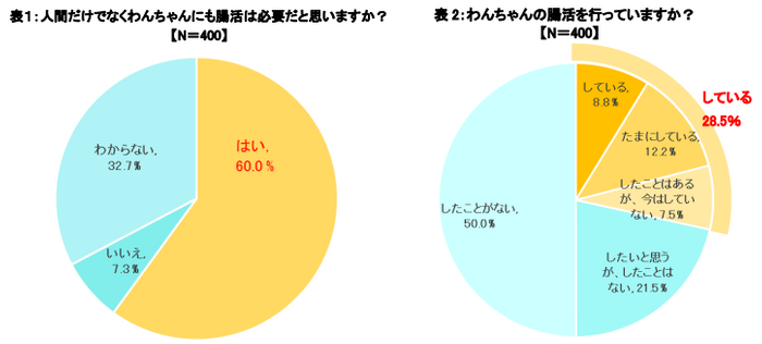◆過半数(60.0%)の飼い主さんが「わんちゃんにも腸活は必要」と回答。実際に実践しているのは約3割(28.5%)にとどまるものの、徐々に浸透!?