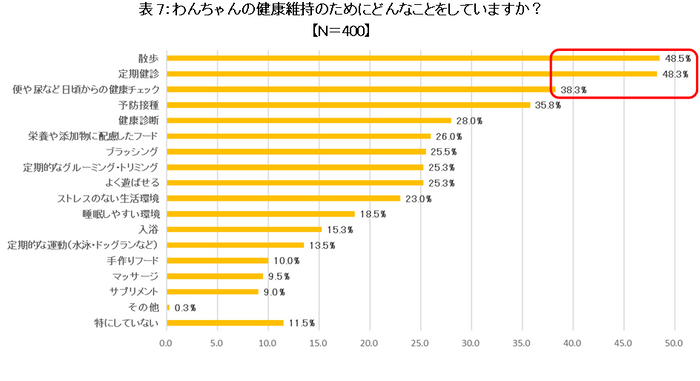 ◆健康維持のためにしていることは「散歩」(48.5%)がトップ。続いて「定期健診」(48.3%)、「便や尿など日頃からの健康チェック」(38.3%)が上位に。