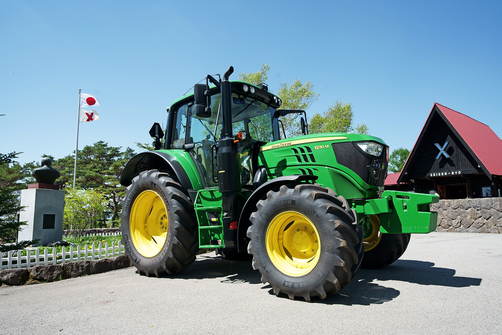 清泉寮ジャージー牧場では現在、昨年加わった最新型のJD-6130Mを含む6台のジョンディアトラクターが活躍しており、ジャージー牛の放牧飼育を主体とする循環型酪農に取り組んでいます。清泉寮には1951年、清里開拓及び食糧難解決のために尽力していた清泉寮創設者ポール・ラッシュ博士に賛同した米国人実業家が寄付したのがはじまり。以来同トラクターは清里開拓のシンボルとして活躍してきました。昨年はじめて年末年始に合わせて展示したところ好評だったため、ヤンマーアグリジャパン株式会社関東甲信越支社のご協力により、今年は期間を延長して特別展示します。今回展示のトラクターには、ジョンディアトラクター製造開始から100周年の記念プレートが取り付けられています。2018年に納車されたトラクターだけに着けられた大変貴重なものです。