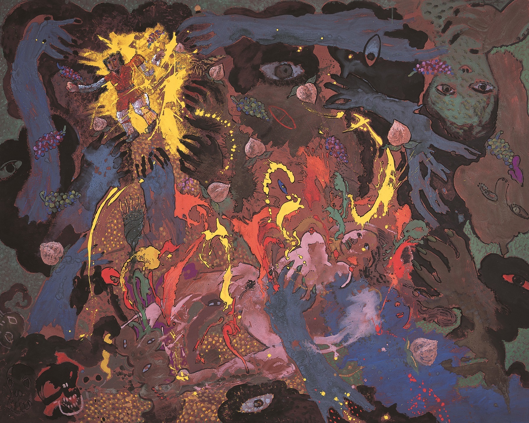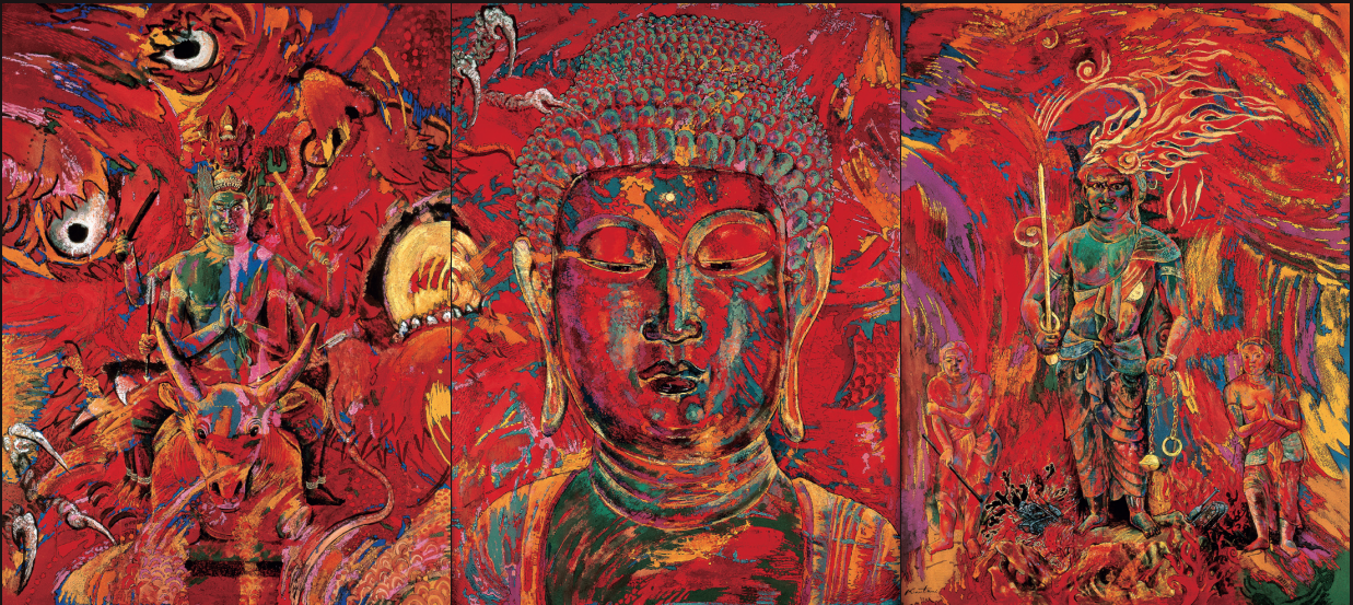 六臂に法具を持ち厳しい面持ちで念仏を唱える降三世明王(ごうざんぜみょうおう)、その背後には大爆発によって立ち上る幾層にも重なった黒煙が印象的に描かれている。そして、画面下に描き込まれた無念の眼たちが鑑賞者を覗く。