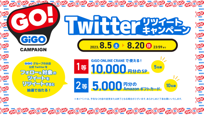 株式会社GENDA GiGO Entertainment(本社:東京都港区 代表取締役社長:二宮一浩 以下当社)が運営する全国251店のアミューズメント施設ブランド「GiGO」において、この夏お得にゲームを楽しんでいただくために、「GiGOグループのお店」「GiGOアプリ」「GiGO ONLINE CRANE」にて、2023年8月5日(土)~2023年8月20日(日)の期間で「GO!GiGO」キャンペーンを開催します。