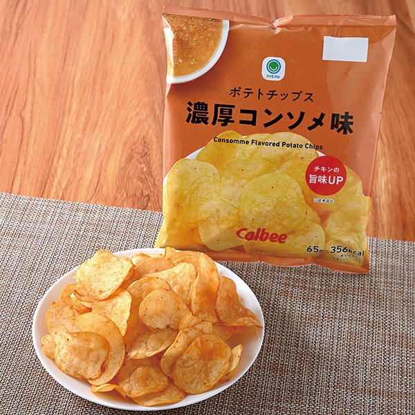 【内容】程よいスパイス感に、濃厚なチキンと香味野菜の旨みがクセになるコンソメ味のポテトチップスです。