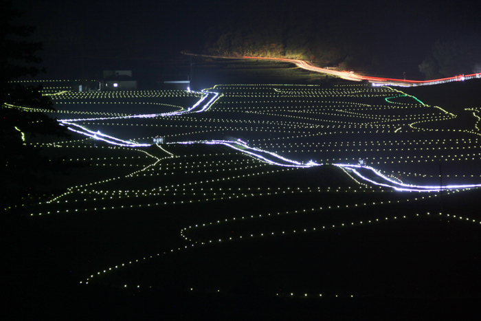 山間の広大な水田のあぜ道に、ボランティアの手によりひとつひとつ設置された約1万個のソーラーLEDライトが、期間中毎日点灯します。