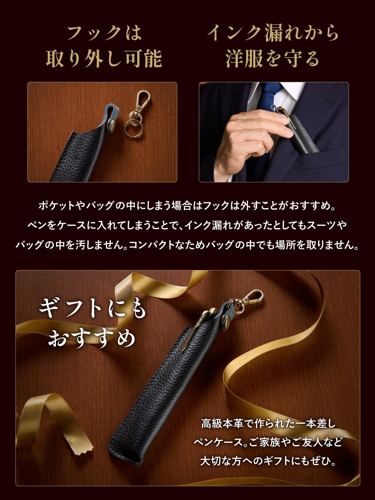 本商品は、「大切なペンを一本だけ、丁寧に持ち歩く」というコンセプトのもと開発された、万年筆やボールペン専用の一本差しペンケースです。