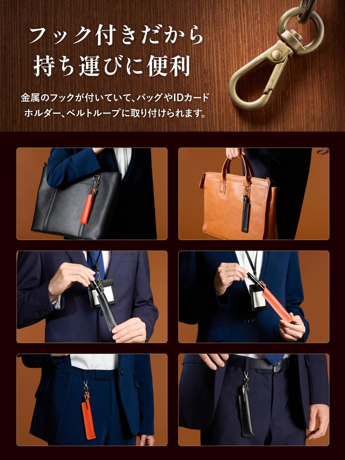 バッグの持ち手、IDカードホルダー、ベルトループなどに取り付け可能。