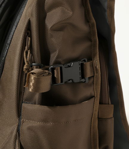 バックパックとしての拡張性を保つための特徴的なフラップ部分には、米軍ミルスペック規格と同じデイジーチェーンを採用。縦横に配置されたナイロンストラップで、規格に合致したあらゆるものをアタッチでき、さらなる拡張性を持たせました。