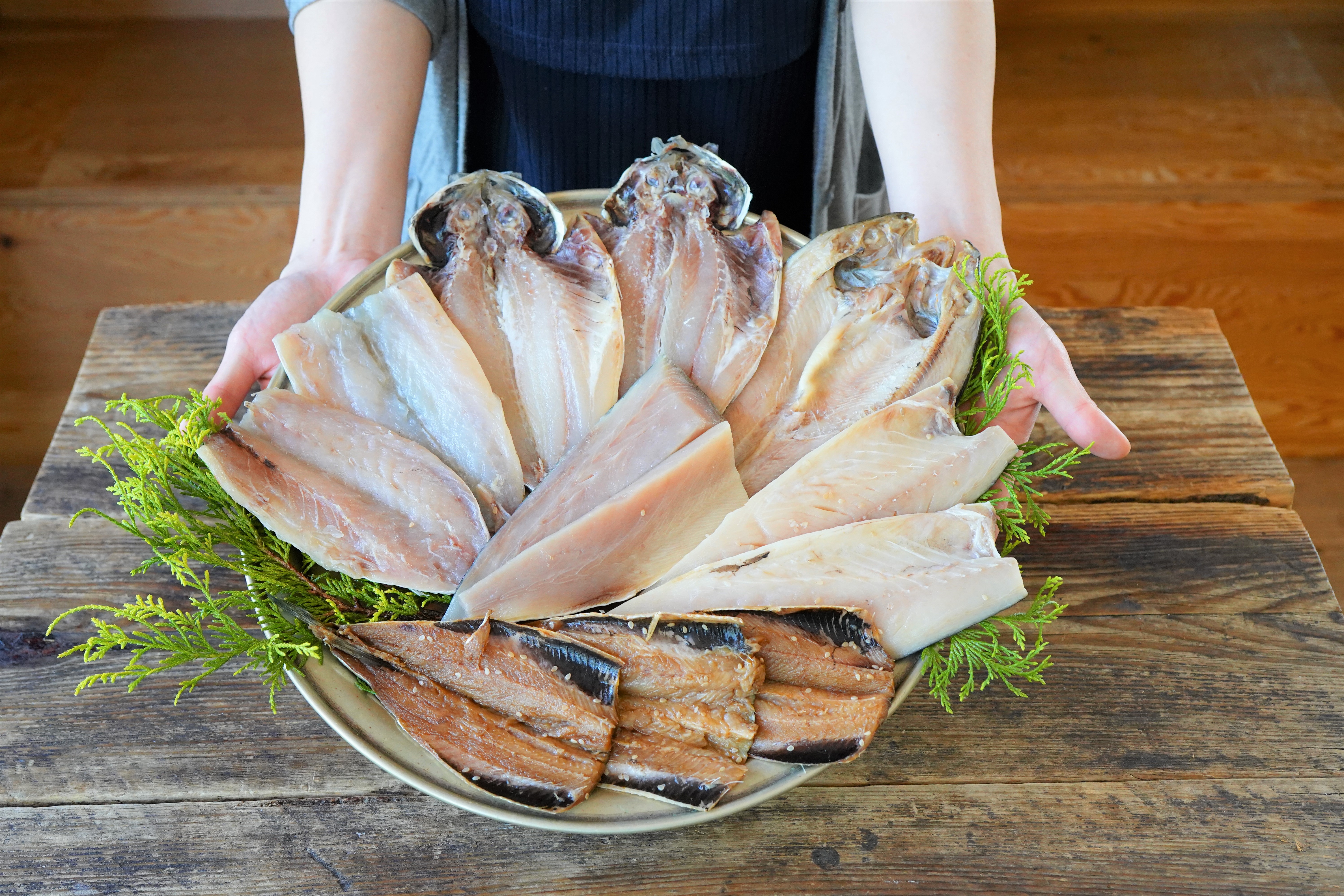 ■内容量:その時おすすめの干物を6種(例:ワイン仕込みさば2枚、霜降あじ開き1枚、あじ白みりん3枚、いわし黒みりん3枚、かます塩干し2枚、真ほっけ開き1枚のセット)