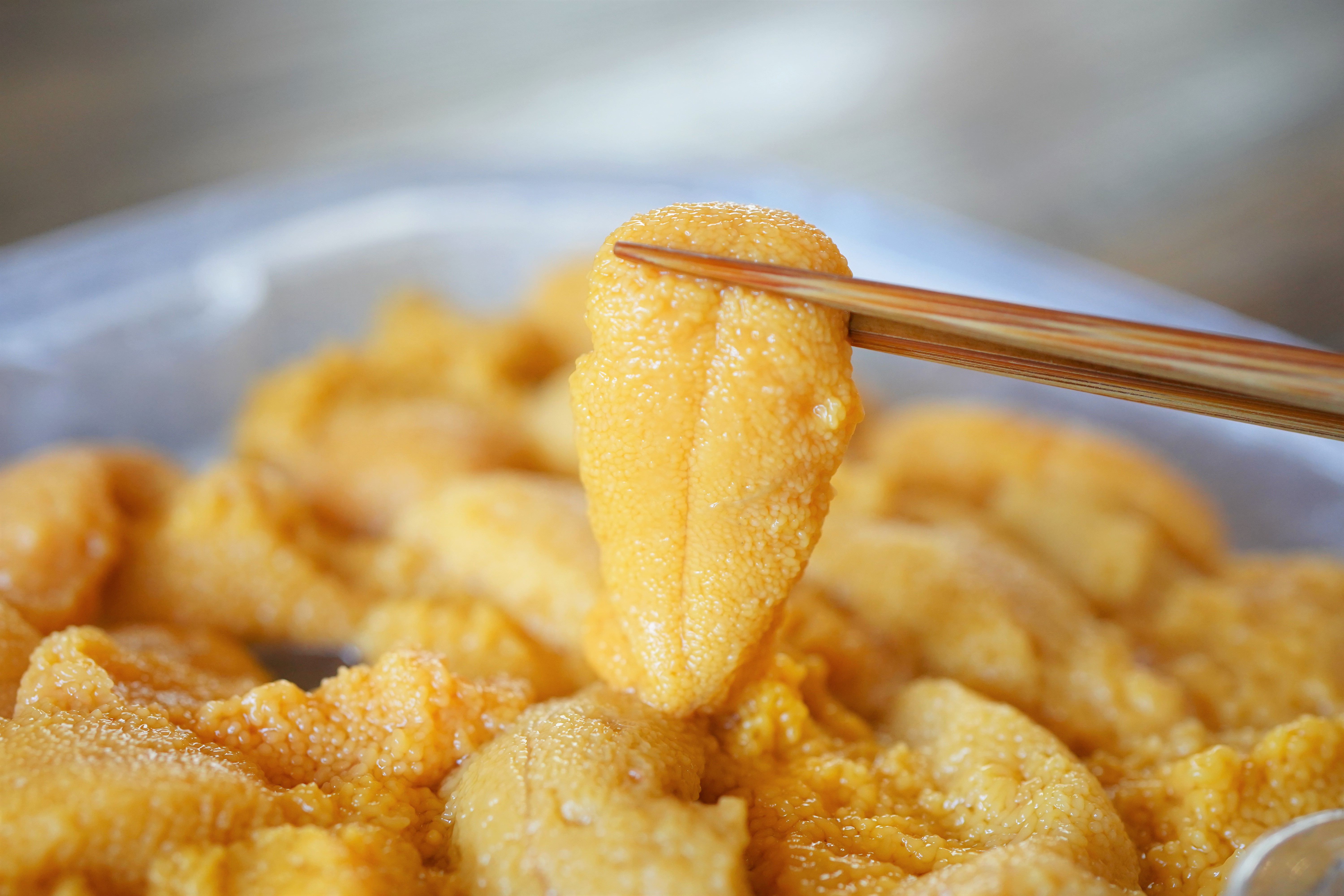 今が旬、北三陸ファクトリーさんの「四年うに」です。最大の特徴は、一度食べたら忘れられない、その極上の舌触りと甘み。一般的には、うにの型崩れを防ぐためにミョウバンを使うのですが、北三陸ファクトリーさんの生うにはミョウバンを含む添加物は一切使用していません。ミョウバン特有の苦みや臭みがないため、うに本来の極上の舌触りと甘みを堪能できます。