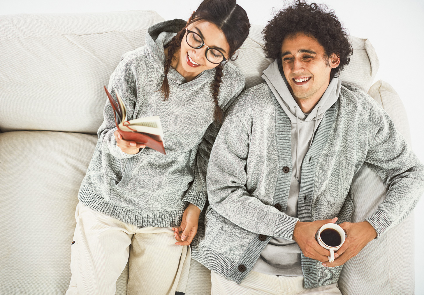 (左)ニットパーカ (右)ニットカーディガン 各9,800円(税込)