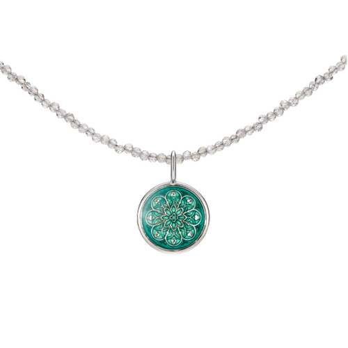 このほどの新作は、ゴシック建築などに見られる円形のステンドグラス“バラ窓”をモチーフにしたペンダントトップです。ベースとなる金属の高低差により樹脂の色味に濃淡が生まれ、美しい模様が浮かび上がります。ステンドグラスから射し込む“希望の光”に想いをこめて、大切な方への贈り物や自分へのご褒美としてもおすすめのデザインです。