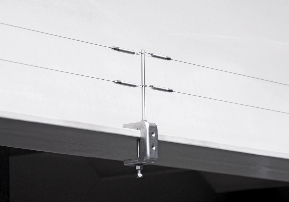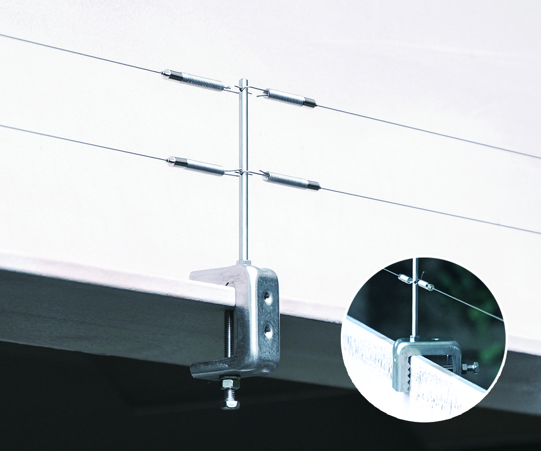 「スマートクランプ支柱」は鋼材にしっかりと取り付けられ、2段のステンレスワイヤーを支えることで効果的に鳥の着地を防止します。シンプルで目立ちにくいデザインながら、高い機能性を備えた製品となっています。