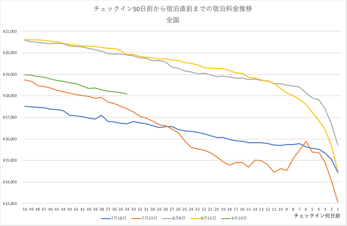 チェックイン日50日前から宿泊直前までの全国平均宿泊料金推移