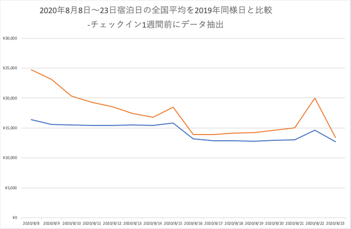 2020年の夏休みで宿泊料金が最も高かった2020年8月8日から8月23日の宿泊料金を2019年の同様日と比較した。