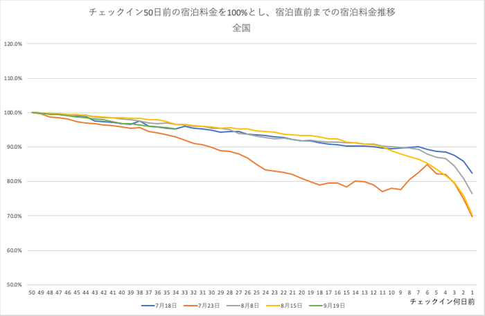 9月19日の5万円以上(黄色)の傾向はその他チェックイン日よりも早い段階で上昇している。9月4連休にGotoキャンペーンを活用して5万円以上の宿泊施設を予約する場合は早めに予約したほうがお得である。