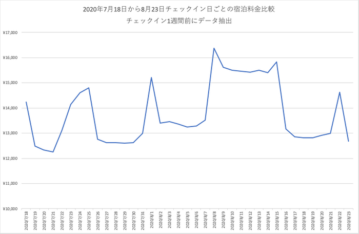 2020年7月18日から8月23日チェックイン日ごとの宿泊料金比較(チェックイン日1週間前に販売している宿泊プラン料金)