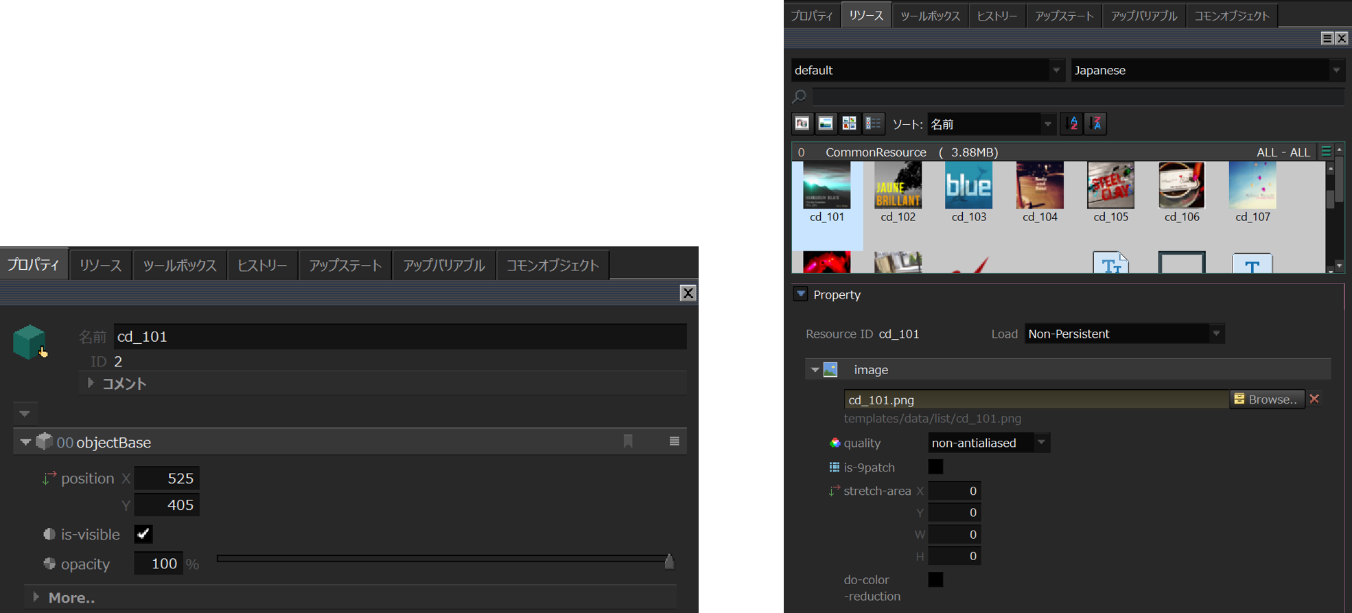 これまで、オブジェクトのプロパティと共用していたリソースのプロパティウィンドウを分離し、リソースウィンドウの下部に配置することにより操作性を向上させました。