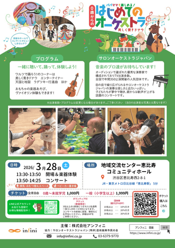 『恵比寿「0歳からの・はじめてのオーケストラ」』が2026年3月28日 (土)に地域交流センター恵比寿 地下1階 コミュニティホール(東京都 渋谷区 恵比寿西 2-8-1)にて開催されます。