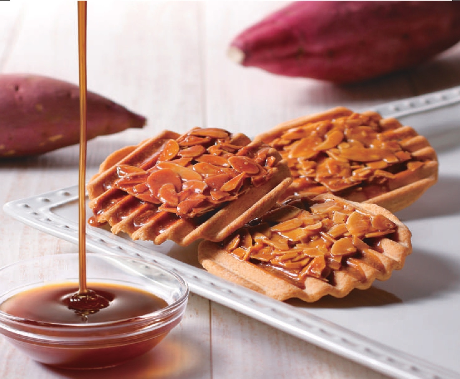 カリッとサクッと楽しめる、お芋の蜜で作ったキャラメルとアーモンドをのせて焼き上げました。