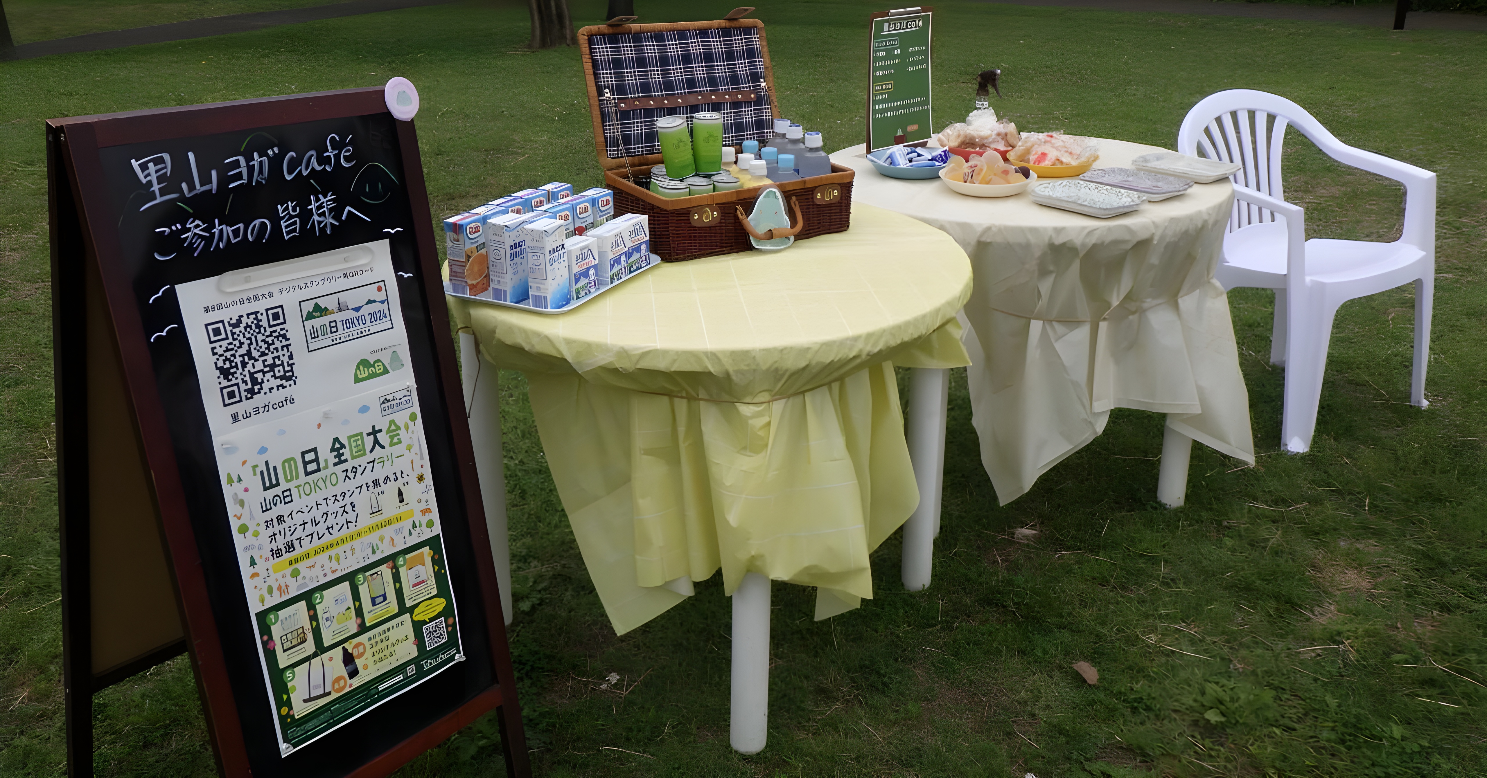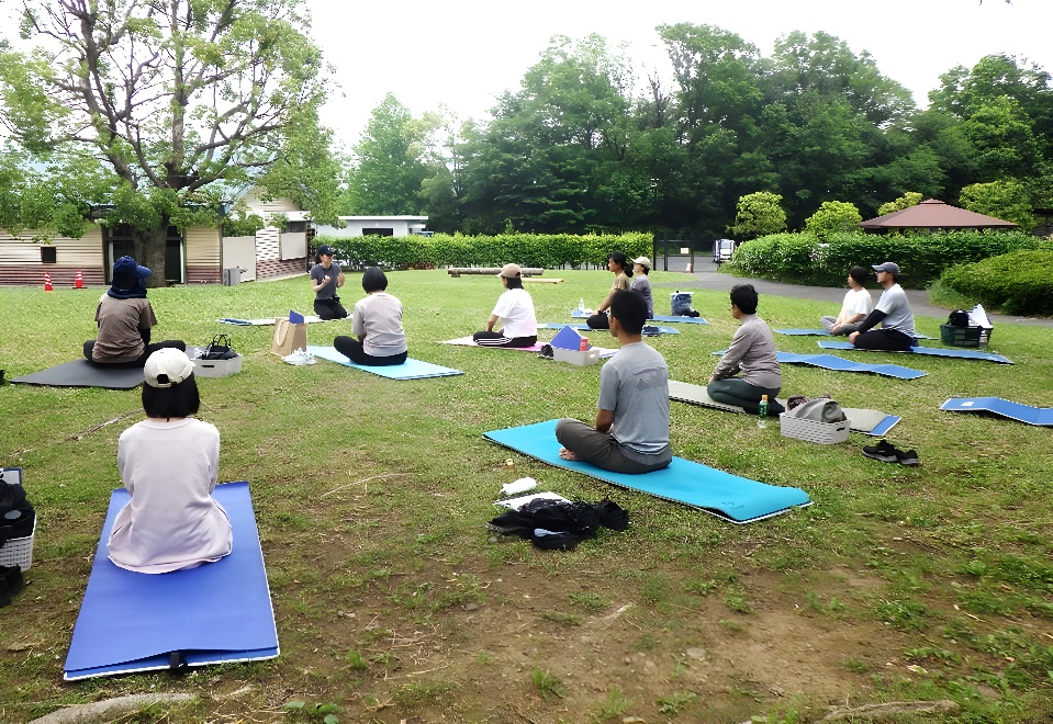 鮮やかな芝生の上でくつろぎながら行う里山ヨガは、気持ちがリフレッシュできると過去に参加した方からも好評をいただいているイベントです。