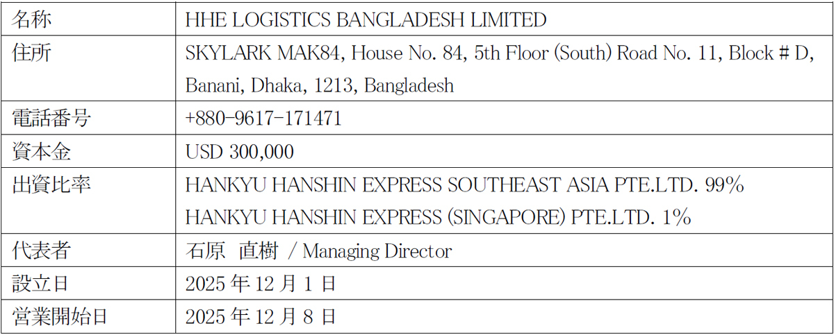 阪急阪神エクスプレス(本社:大阪市北区 代表取締役社長:谷村 和宏)は、バングラデシュの首都・ダッカに現地法人HHE LOGISTICS BANGLADESH LIMITED を設立しました。