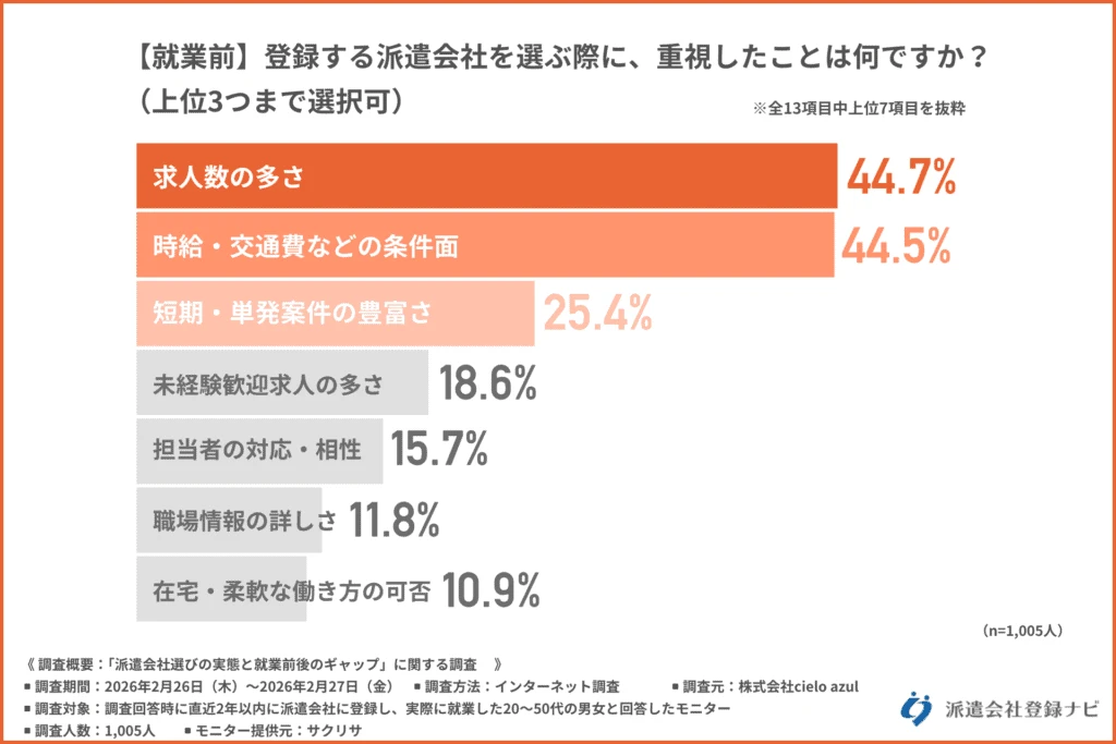 「【就業前】登録する派遣会社を選ぶ際に、重視したこと(上位3つまで選択可)」について尋ねたところ、最も多かったのは「求人数の多さ(希望職種・勤務地の選択肢)(44.7%)」で、次に「時給・交通費などの条件面(44.5%)」「短期・単発案件の豊富さ(25.4%)」となりました。