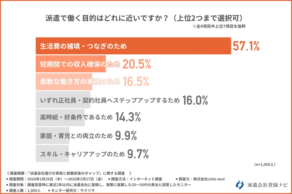 「派遣で働く目的はどれに近いか(上位2つまで選択可)」と尋ねたところ、「生活費の補填・つなぎのため(57.1%)」が最も多く、次に「短期間での収入確保のため(20.5%)」「柔軟な働き方の実現のため(16.5%)」となりました。