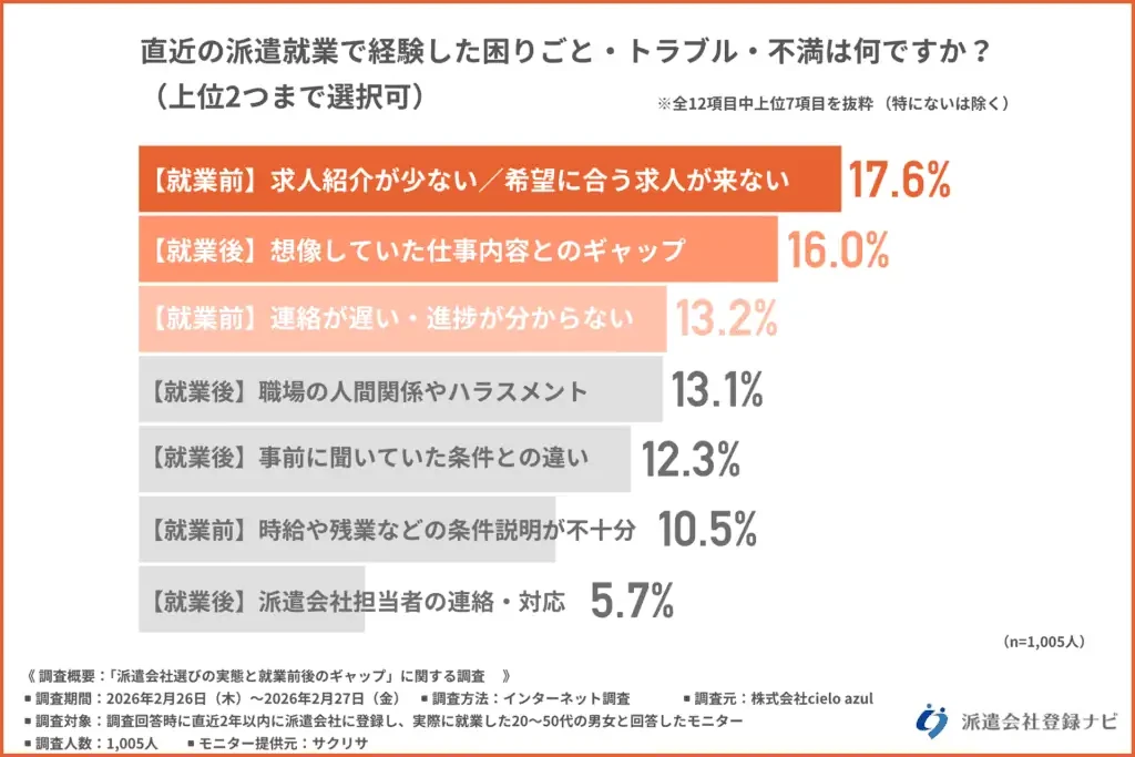 一方で、「直近の派遣就業で経験した困りごと・トラブル・不満(上位2つまで選択可)」について尋ねたところ、最も多かったのは「【就業前】求人紹介が少ない/希望に合う求人が来ない(17.6%)」で、次に「【就業後】想像していた仕事内容とのギャップ(16.0%)」「【就業前】連絡が遅い・進捗が分からない(13.2%)」となりました。