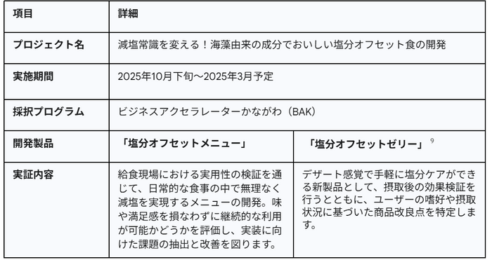採択プロジェクト「減塩常識を変える!海藻由来の成分でおいしい塩分オフセット食の開発」は、食事の味や満足感を損なうことなく健康的な食環境を創出し、神奈川県が目指す「未病改善・健康寿命の延伸」に貢献することを目指します 。