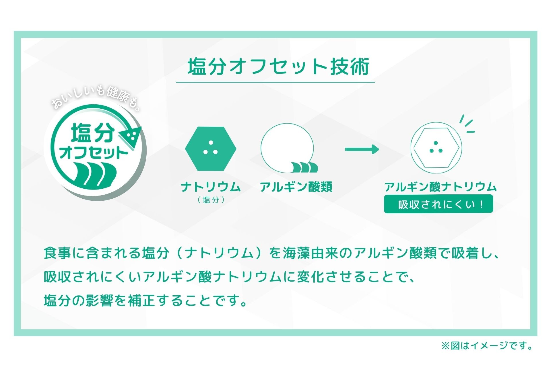 トイメディカルが開発した「塩分オフセット技術」は、海藻由来の食物繊維アルギン酸類を用い、食事中の塩分(ナトリウム)を胃の中で吸着し、吸収しにくい形に変えて、最終的に便として排出するという新しいメカニズムに基づいています。これにより、味を変えることなく、実質的に“減塩”の効果を得ることが可能です。またカリウムを使用していないため、カリウム制限のある方にも安心してご使用頂くことができます。
