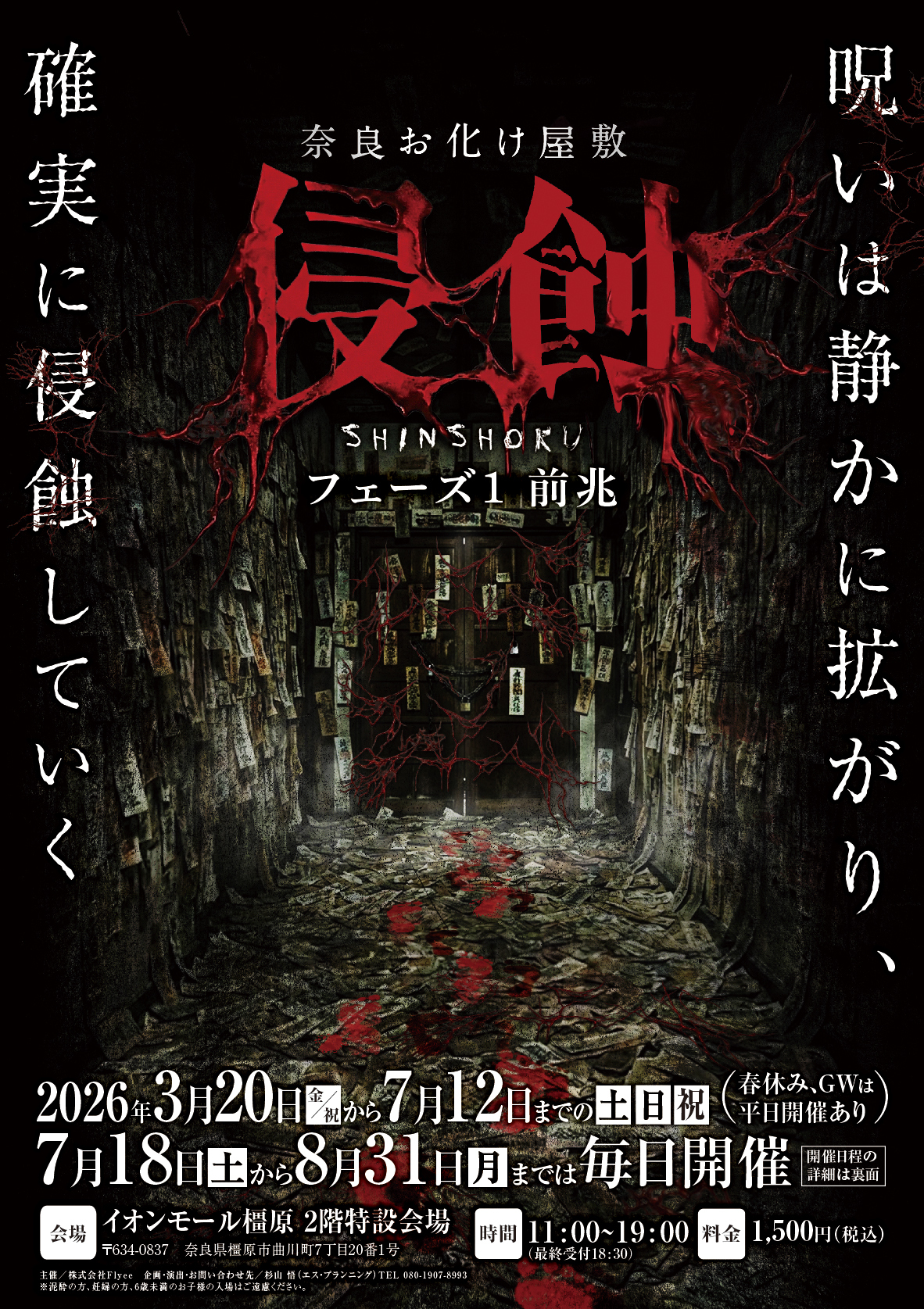 イベント企画 エス・プランニング(所在地:広島県広島市、代表:杉山 悟)は、奈良県にあるイオンモール橿原にて、ホラーイベント奈良お化け屋敷「浸蝕」を2026年3月20日から8月31日まで開催いたします。