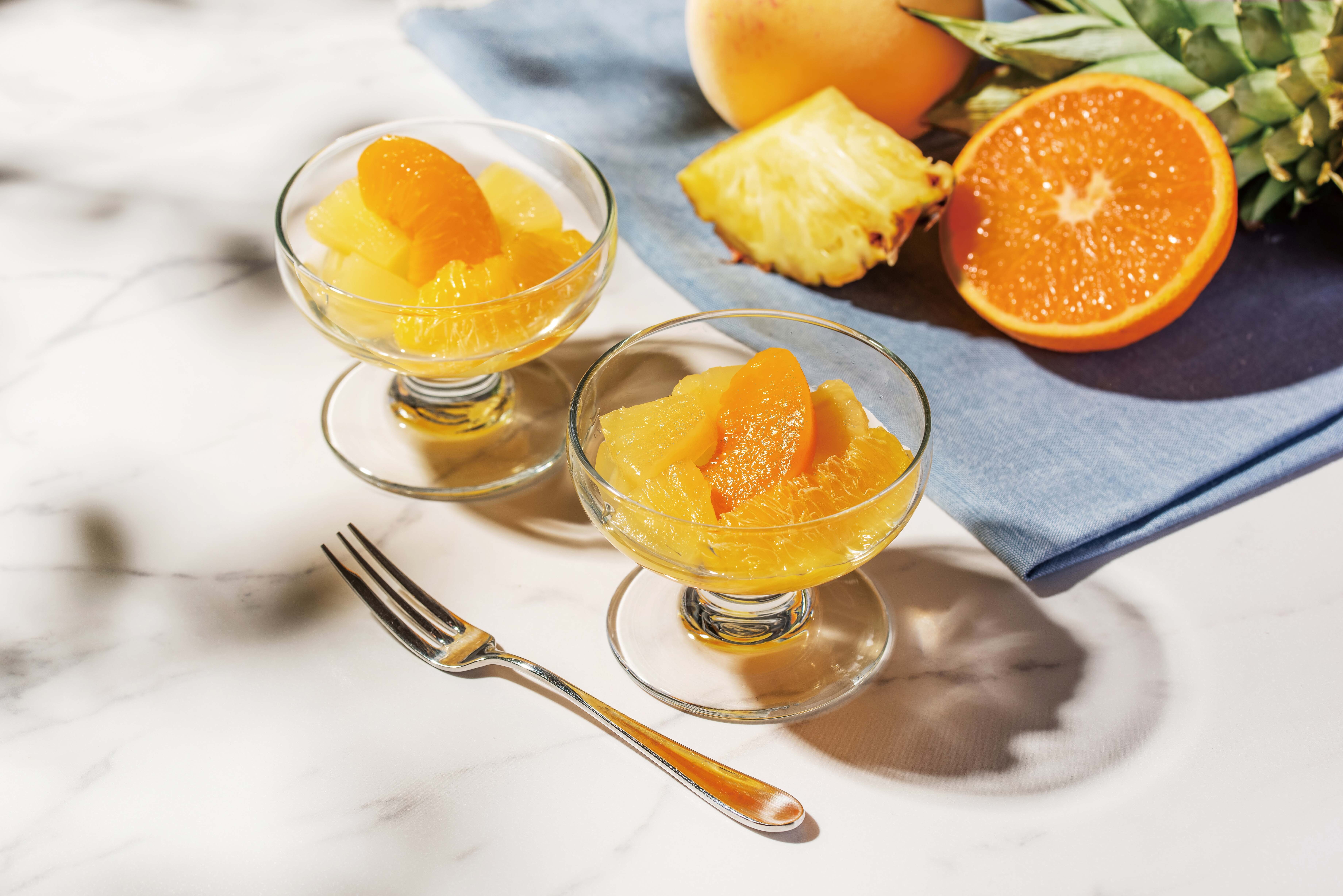 南アフリカ産のバレンシアオレンジとイエローピーチ、フィリピン産パインアップルを組み合わせました。そのまま冷やして、オレンジ果汁入りシラップと合わせてお楽しみください。(2人用、エキストラライトシラップ使用)