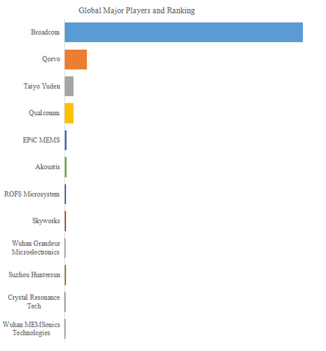 LP Informationのトップ企業研究センターによると、BAWフィルタの世界的な主要製造業者には、Broadcom、Qorvo、Taiyo Yuden、Qualcomm、EPiC MEMS、Akoustis、Skyworks、ROFS Microsystem、Wuhan Grandeur Microelectronics、Suzhou Huntersunなどが含まれている。2024年、世界のトップ10企業は売上の観点から約99.0%の市場シェアを持っていた。