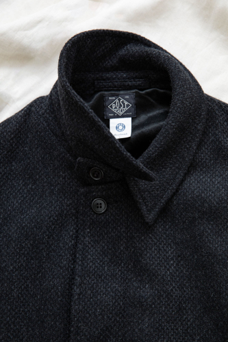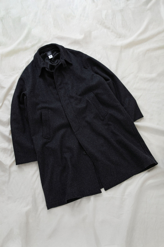 首元のチンストラップや裾のノーベント仕様、美しく広がるAラインのシルエット、そしてスプリットラグランスリーブなどの仕立てが特徴となっているアイテムに、こちらも生地を別注した一着。