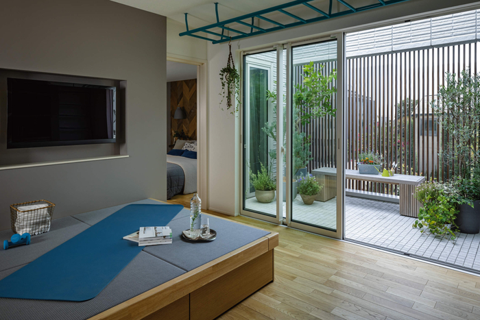 (3) リラックスできる環境で運動:大開口の窓の近くやバルコニーなど、風や日光を感じられる場所での運動もおすすめです。自然を感じながらリラックスして、より気持ちよく運動を続けられます。音楽やアロマで気分を変えても良いかもしれません。さらに、運動スペースの近くにウェアや運動器具用の収納を設ければ、すぐに取り出せて便利です。習慣的に利用する運動器具は、かごにまとめて収納すると持ち運びやすく、また、見えるところに置いておくことで運動しなければという気持ちにもなります。