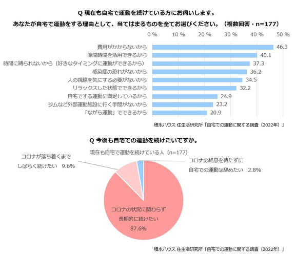 調査では、半数以上の人がコロナ禍で以前より運動不足を感じており、自宅で運動をしたい人が多いことがわかりました。その反面、自宅で運動を始めたくても始められていない人が多く、自宅で運動をしていない理由に「忙しい・時間がない」「スペースがない」などが挙がりました。一方、コロナ禍で運動を始めた人もおり、また、現在自宅で運動している人のほとんどが新型コロナウイルス感染症収束後も長期的に自宅での運動を続けたいと考えていることがわかりました。