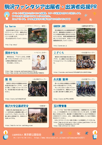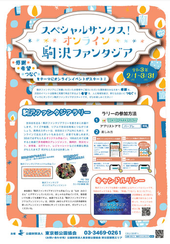 駒沢ファンタジアにご来園いただいたお客様やご協力いただいた関係者のみなさまへ『感謝』を、 次回のイベントは皆様と笑顔で再開できるよう『希望』を、人と地域を結び、新たな出会いに『つなぐ』をテーマにオンライン駒沢ファンタジアがスタートです。ぜひお楽しみください!